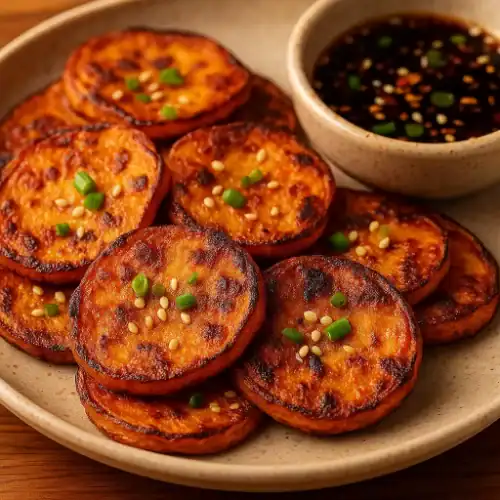 Mix soy sauce, rice vinegar, and a touch of sugar in a small bowl. Add sesame seeds and chopped scallions. For a spicy twist, stir in a bit of gochujang. This sauce lifts every bite of your Goguma Jeon, giving it the perfect Korean balance of salty, sweet, and tangy.